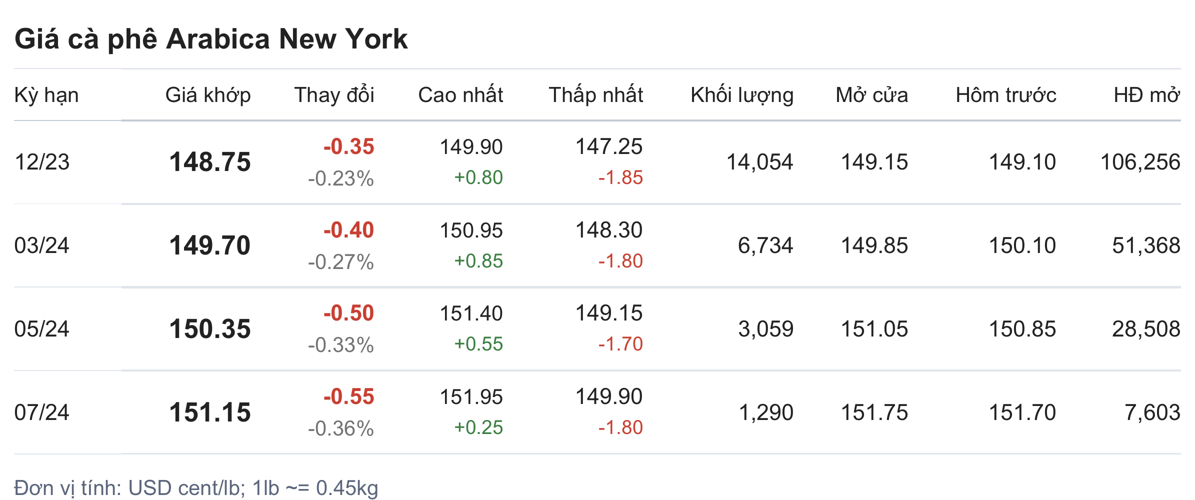 Giá cà phê arabica giao tháng 12/2023 tại New York ở mức 148,75 US cent/pound sau khi giảm 0,23% (tương đương 0,35 US cent) tại thời điểm khảo sát vào lúc 6h46 (giờ Việt Nam).