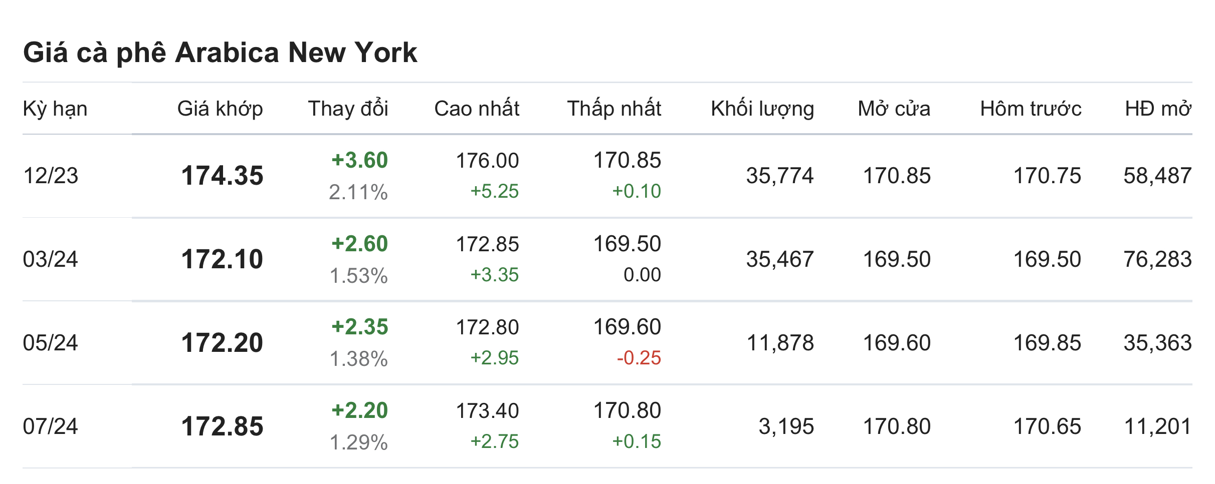 Giá cà phê arabica giao tháng 12 tại New York ở mức 174,35US cent/pound sau khi tăng 2,11% (tương đương 3,6 US cent) tại thời điểm khảo sát vào lúc 7h30 (giờ Việt Nam).