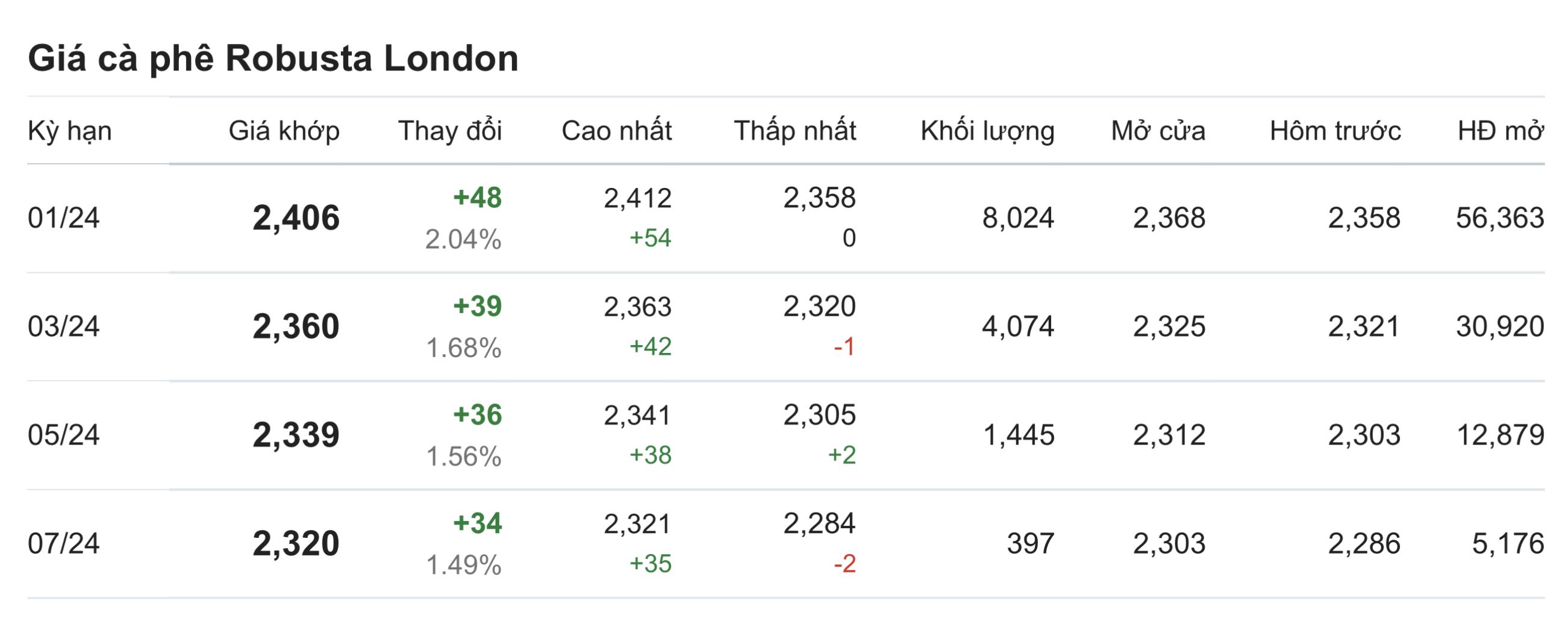 Theo ghi nhận, giá cà phê trên thị trường thế giới giảm. Theo đó, giá cà phê trực tuyến robusta tại London giao tháng 1/2024 được ghi nhận tại mức 2.406 USD/tấn sau khi tăng 2,04% (tương đương 48 USD).