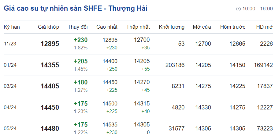 Trên Sàn giao dịch hàng hóa tương lai Thượng Hải (SHFE), giá cao su RSS3 giao kỳ hạn tháng 11/2023 được điều chỉnh lên mức 12.895 nhân dân tệ/tấn, tăng 1,82% (tương đương 230 nhân dân tệ) so với giao dịch trước đó.