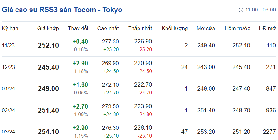 Tại Sở giao dịch hàng hóa Tokyo (TOCOM), giá cao su kỳ hạn giao tháng 11/2023 đạt mức 252,1 yen/kg, tăng 0,16% (tương đương 0,4 yen/kg) tại thời điểm khảo sát vào lúc 6h30 (giờ Việt Nam).