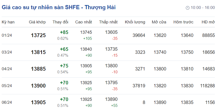 Trên Sàn giao dịch hàng hóa tương lai Thượng Hải (SHFE), giá cao su RSS3 giao kỳ hạn tháng 1/2024 được điều chỉnh lên mức 13.725nhân dân tệ/tấn, tăng 0,62% (tương đương 85 nhân dân tệ) so với giao dịch trước đó.