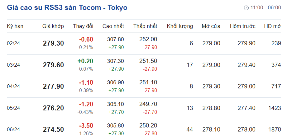 Tại Sở giao dịch hàng hóa Tokyo (TOCOM), giá cao su kỳ hạn giao tháng 2/2024 đạt mức 279,3 yen/kg, giảm 0,21% (tương đương 0,6 yen/kg) tại thời điểm khảo sát vào lúc 8h00 (giờ Việt Nam).