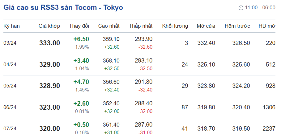 Tại Sở giao dịch hàng hóa Tokyo (TOCOM), giá cao su giao kỳ hạn tháng 3/2024 ghi nhận mức 333 yen/kg, tăng 1,99% tại thời điểm khảo sát vào lúc 6h40(giờ Việt Nam).