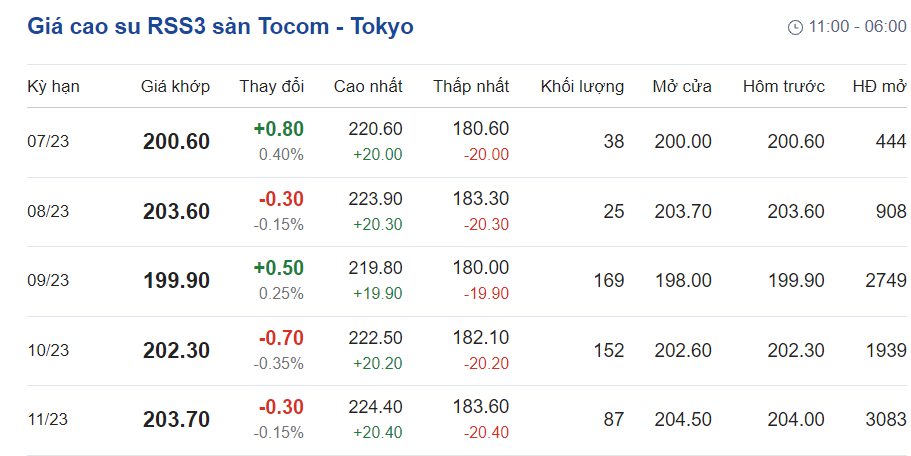 Tại Sở giao dịch hàng hóa Tokyo (TOCOM), giá cao su kỳ hạn giao tháng 7/2023 đạt mức 200,6 yen/kg, tăng 0,4% (tương đương 0,8 yen/kg) tại thời điểm khảo sát vào lúc 6h50 (giờ Việt Nam).