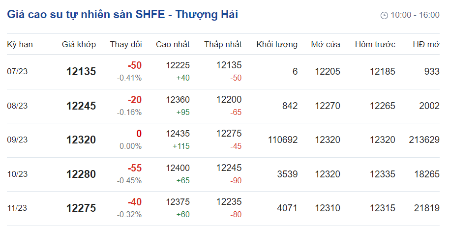 Trên Sàn giao dịch hàng hóa tương lai Thượng Hải (SHFE), giá cao su RSS3 giao kỳ hạn tháng 7/2023 được điều chỉnh lên mức 12.225 nhân dân tệ/tấn, tăng 0,33% (tương đương 40 nhân dân tệ) so với giao dịch trước đó.