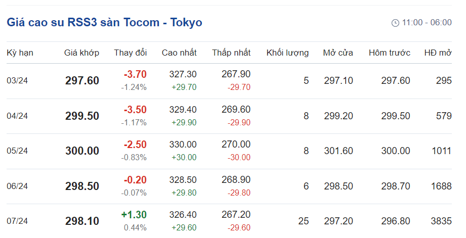 Tại Sở giao dịch hàng hóa Tokyo (TOCOM), giá cao su kỳ hạn giao tháng 3/2024 đạt mức 297,6 yen/kg, giảm 1,24% (tương đương 3,7 yen/kg) tại thời điểm khảo sát vào lúc 6h00 (giờ Việt Nam).