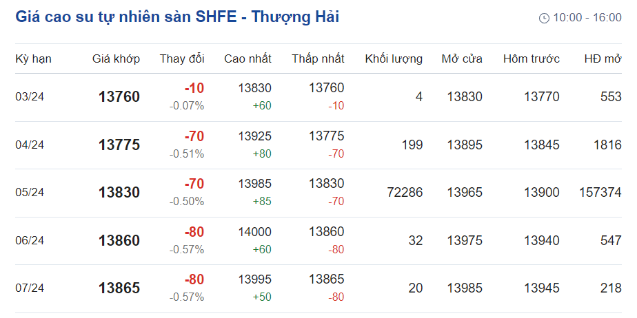 Trên Sàn giao dịch hàng hóa tương lai Thượng Hải (SHFE), giá cao su RSS3 giao kỳ hạn tháng 3/2024 được điều chỉnh xuống mức 13.760 nhân dân tệ/tấn, giảm 0,07% (tương đương 10 nhân dân tệ) so với giao dịch.