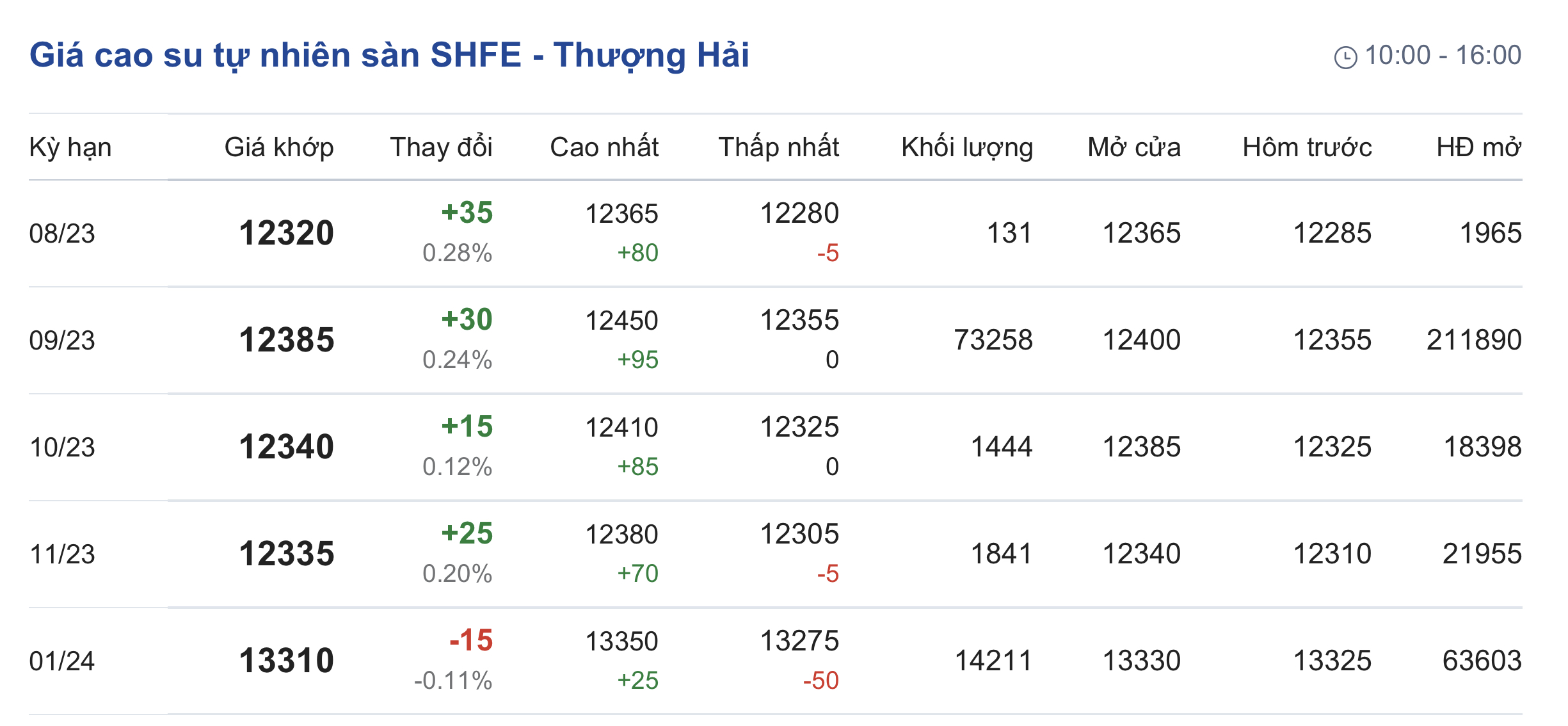 Trên Sàn giao dịch hàng hóa tương lai Thượng Hải (SHFE), giá cao su RSS3 giao kỳ hạn tháng 7/2023 được điều chỉnh lên mức 12.320 nhân dân tệ/tấn, tăng 0,28% (tương đương 35 nhân dân tệ) so với giao dịch trước đó.