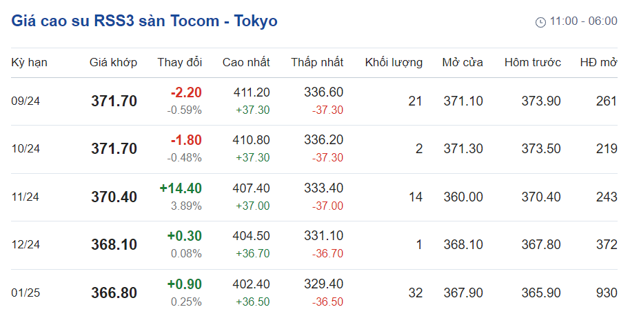 Tại thời điểm khảo sát, giá RSS3 tại Sở giao dịch hàng hóa Tokyo (TOCOM) giao tháng 9/2024 giảm 2,2 yen (tương đương 0,59%); xuống mức 371,7 yen/kg. Còn giao tháng 10/2024 giảm 1,8 yen (tương đương 0,48%); ở mức 371,70 yen/kg.