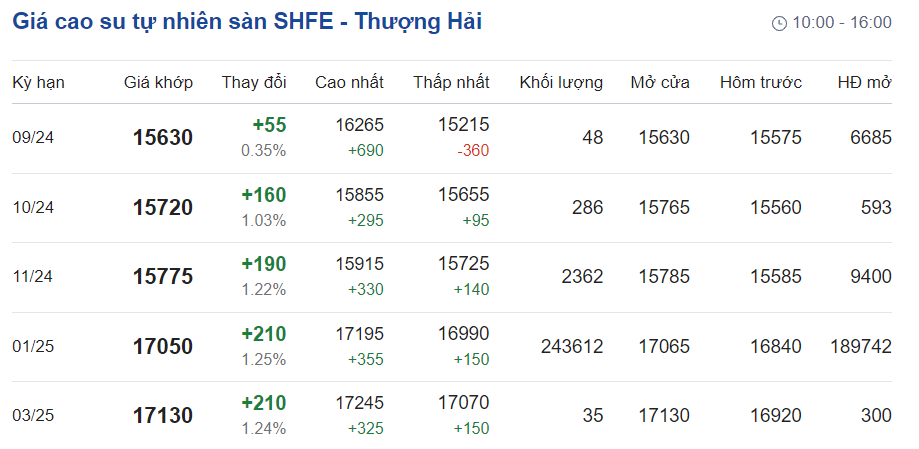 Tại sàn giao dịch hàng hóa tương lai Thượng Hải (SHFE), giá mủ cao su tự nhiên giao kỳ hạn tháng 9/2024 tăng thêm 55 CNY (tương đương 0,35%), xuống mức 15.630 CNY/tấn. Còn giao kỳ hạn tháng 10/2024 tăng 160 CNY (tương đương 1,03%), ở mức 15.720 CNY/tấn.