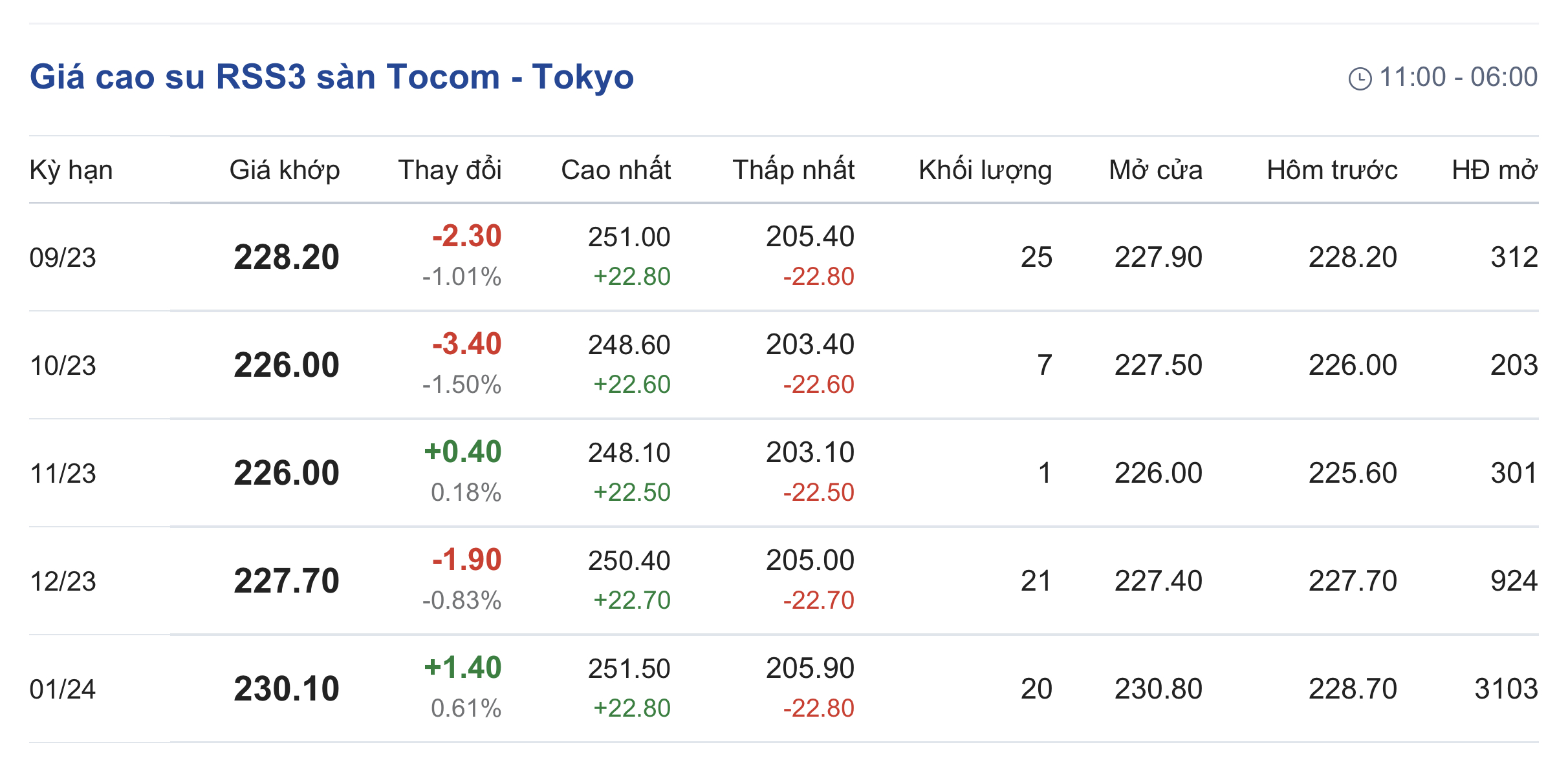 Tại Sở giao dịch hàng hóa Tokyo (TOCOM), giá cao su kỳ hạn giao tháng 9/2023 đạt mức 228,2 yen/kg, giảm 1,01% (tương đương 2,3 yen/kg) tại thời điểm khảo sát vào lúc 6h48 (giờ Việt Nam).
