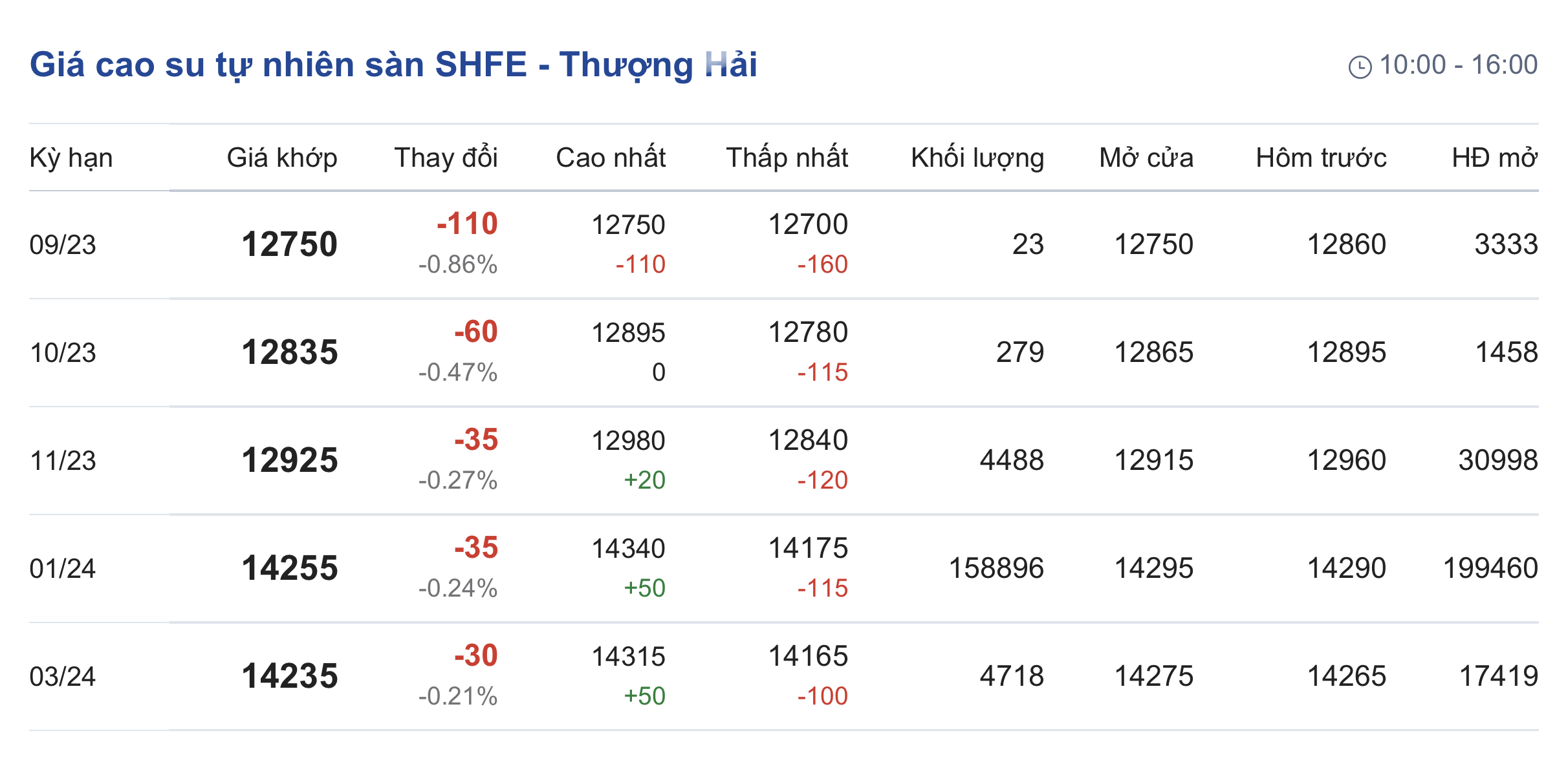 Trên Sàn giao dịch hàng hóa tương lai Thượng Hải (SHFE), giá cao su RSS3 giao kỳ hạn tháng 9/2023 được điều chỉnh xuống mức 12.750 nhân dân tệ/tấn, giảm 0,86% (tương đương 110 nhân dân tệ) so với giao dịch trước đó.