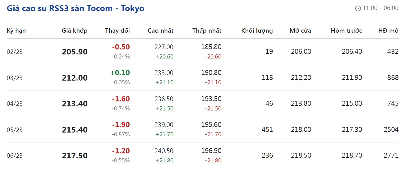 Tại Sở giao dịch hàng hóa Tokyo (TOCOM), giá cao su kỳ hạn giao tháng 2/2023 đạt mức 205 yen/kg, giảm 0,24% (tương đương 0,5 yen/kg) tại thời điểm khảo sát vào lúc 7h15 (giờ Việt Nam).