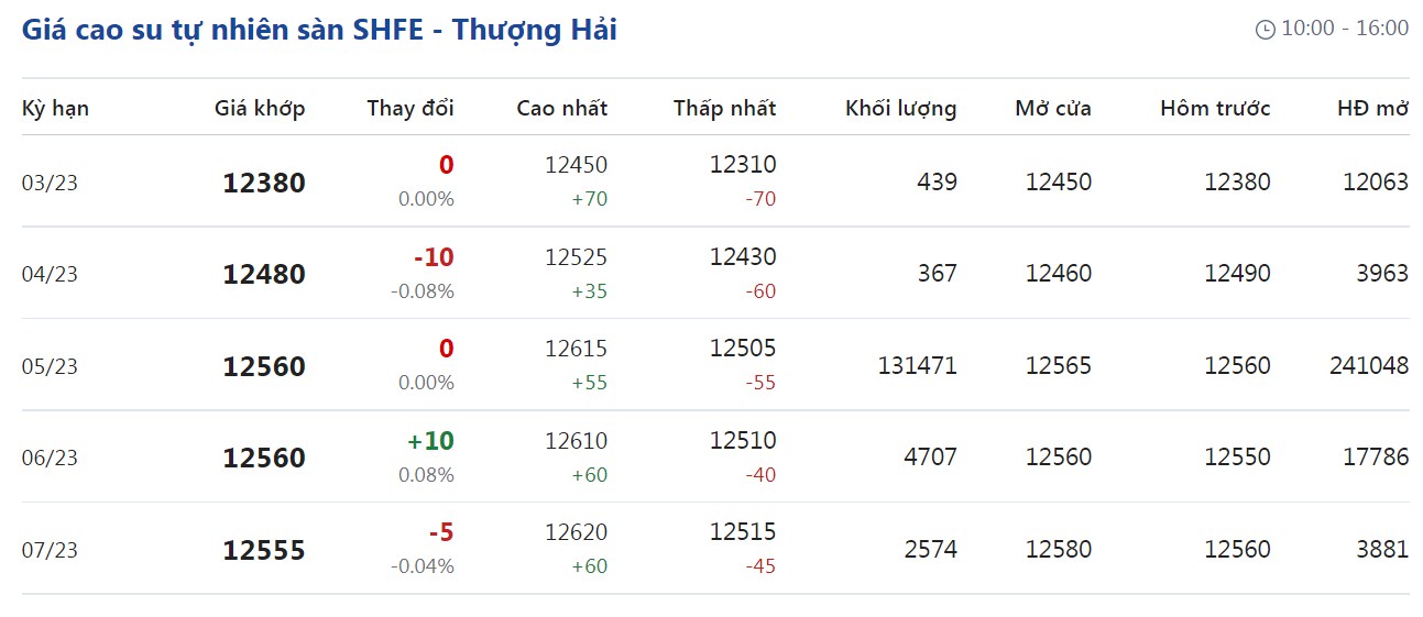 Trên Sàn giao dịch hàng hóa tương lai Thượng Hải (SHFE), giá cao su RSS3 giao kỳ hạn tháng 3/2023 được điều chỉnh xuống mức 12.380 nhân dân tệ/tấn, không đổi so với giao dịch trước đó.