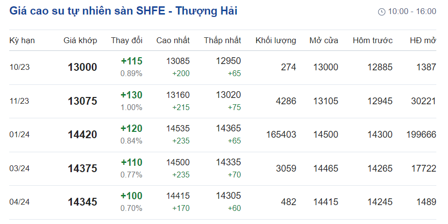 Trên Sàn giao dịch hàng hóa tương lai Thượng Hải (SHFE), giá cao su RSS3 giao kỳ hạn tháng 9/2023 được điều chỉnh lên mức 13.000 nhân dân tệ/tấn, tăng 0,89% (tương đương 115 nhân dân tệ) so với giao dịch trước đó.