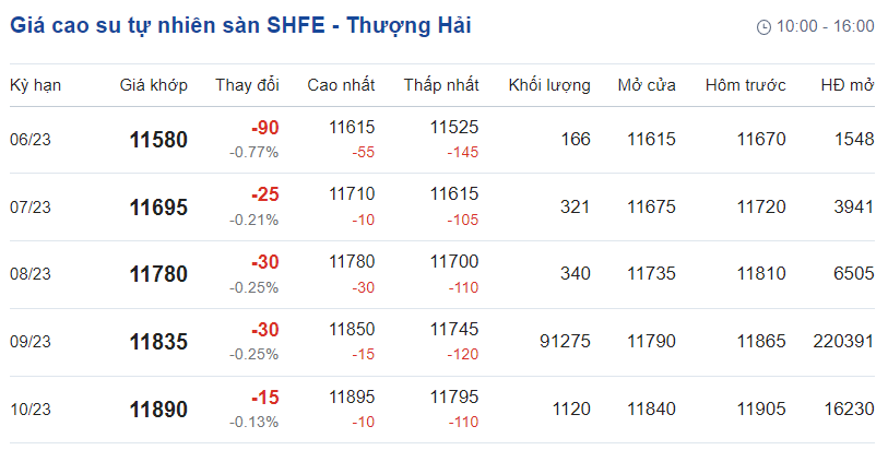 Trên Sàn giao dịch hàng hóa tương lai Thượng Hải (SHFE), giá cao su RSS3 giao kỳ hạn tháng 6/2023 được điều chỉnh xuống mức 11.580 nhân dân tệ/tấn, giảm 0,77% (tương đương 90 nhân dân tệ) so với giao dịch trước đó.