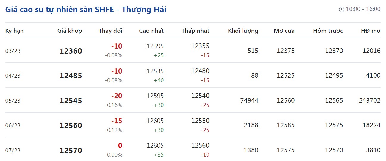 Trên Sàn giao dịch hàng hóa tương lai Thượng Hải (SHFE), giá cao su RSS3 giao kỳ hạn tháng 3/2023 được điều chỉnh xuống mức 12.360 nhân dân tệ/tấn, giảm 0,08% (tương đương 10 nhân dân tệ) so với giao dịch trước đó.
