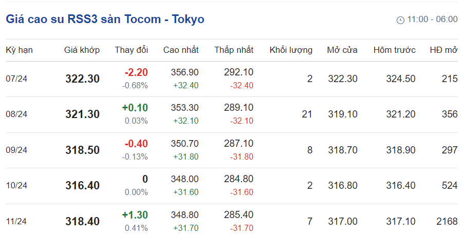 Tại Sở giao dịch hàng hóa Tokyo (TOCOM), giá cao su giao kỳ hạn tháng 9/2024 giảm 0,13% về ở mức 318,5 yen/kg tại thời điểm khảo sát vào lúc 6h00 (giờ Việt Nam).