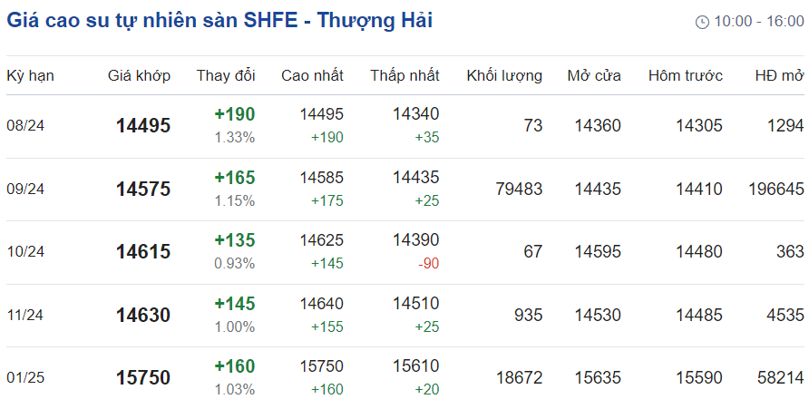 Trên Sàn giao dịch hàng hóa tương lai Thượng Hải (SHFE), giá cao su RSS3 giao kỳ hạn tháng 9/2024 tăng 0,1% ở mức 14.465 nhân dân tệ/tấn.