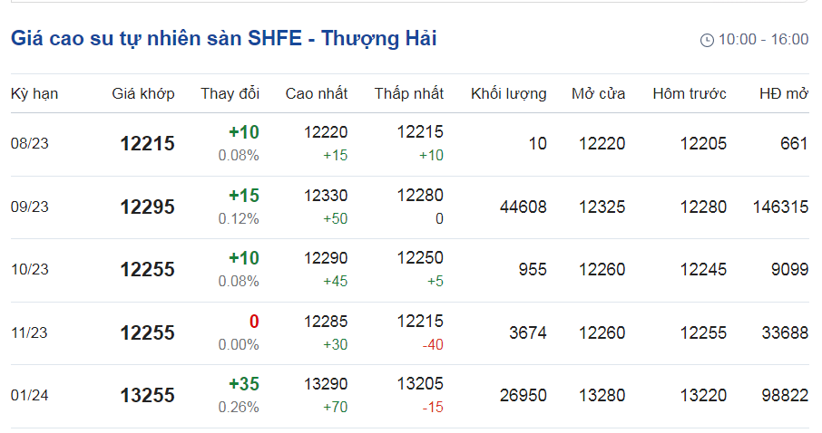 Trên Sàn giao dịch hàng hóa tương lai Thượng Hải (SHFE), giá cao su RSS3 giao kỳ hạn tháng 8/2023 được điều chỉnh lên mức 12.215 nhân dân tệ/tấn, tăng 0,08% (tương đương 10 nhân dân tệ) so với giao dịch trước đó.