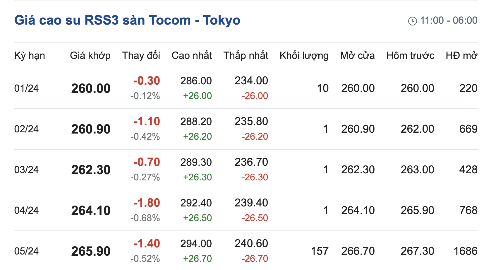 Tại Sở giao dịch hàng hóa Tokyo (TOCOM), giá cao su kỳ hạn giao tháng 1/2024 đạt mức 260 yen/kg, giảm 0,12% (tương đương 0,3 yen/kg) tại thời điểm khảo sát vào lúc 6h24 (giờ Việt Nam).