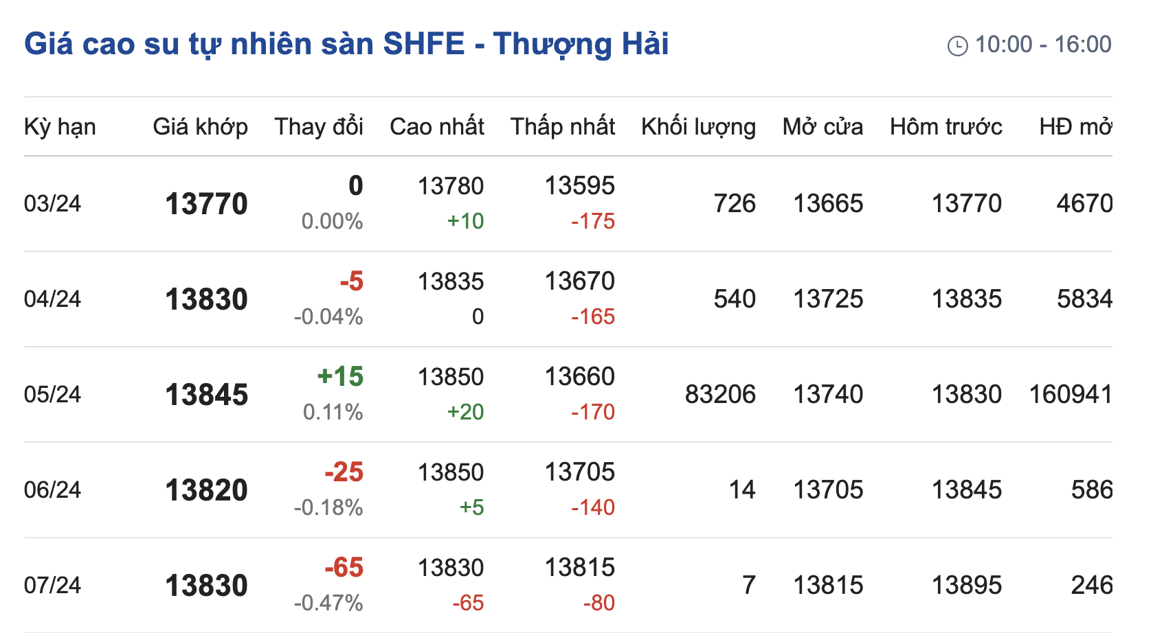 Trên Sàn giao dịch hàng hóa tương lai Thượng Hải (SHFE), giá cao su RSS3 giao kỳ hạn tháng 3/2024 đang giao dịch ở mức 13.770 nhân dân tệ/tấn (không có biến động tại thời điểm khảo sát) so với phiên giao dịch trước đó.