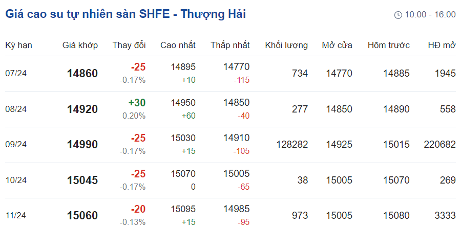 Trên Sàn giao dịch hàng hóa tương lai Thượng Hải (SHFE), giá cao su RSS3 giao kỳ hạn tháng 7/2024 giảm 0,17% ở mức 14.860 nhân dân tệ/tấn.