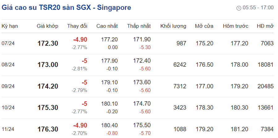 Hợp đồng cao su kỳ hạn tháng 7/2024 trên sàn SICOM Singapore chốt ở 172,3 US cent/kg, giảm 2,77%.
