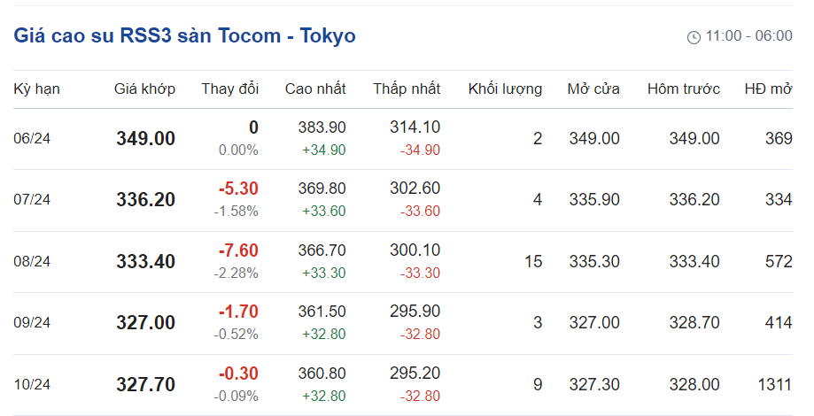Ngày 28/5/2024, giá cao su RSS3 giao kỳ hạn gần ở mức 338 Yên/kg (tương đương 2,15 USD/kg), tăng 8% so với cuối tháng 4/2024 và tăng 63,5% so với cùng kỳ năm 2023.