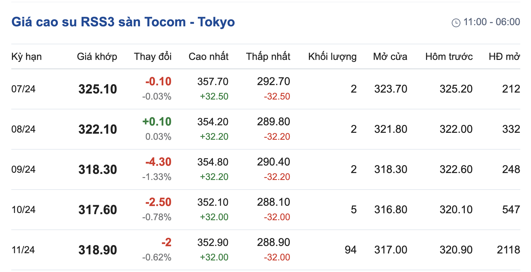 Tại Sở giao dịch hàng hóa Osaka Exchange (OSE), từ đầu tháng 7/2024 đến nay, giá cao su RSS3 liên tục giảm mạnh. Ngày 09/7/2024, giá cao su RSS3 giao kỳ hạn gần giao dịch ở mức 324 Yên/ kg (tương đương 2,01 USD/kg), giảm 6,1% so với cuối tháng 6/2024, nhưng tăng 62,2% so với cùng kỳ năm 2023. Giá cao su kỳ hạn của Nhật Bản giảm xuống mức thấp nhất trong gần 8 tuần do đồng Yên mạnh hơn và giá cao su Thái Lan giảm.