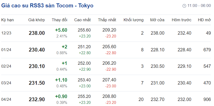 Tại Sở giao dịch hàng hóa Tokyo (TOCOM), giá cao su kỳ hạn giao tháng 12/2023 đạt mức 238 yen/kg, tăng 2,41% (tương đương 5,6 yen/kg) tại thời điểm khảo sát vào lúc 7h30 (giờ Việt Nam).
