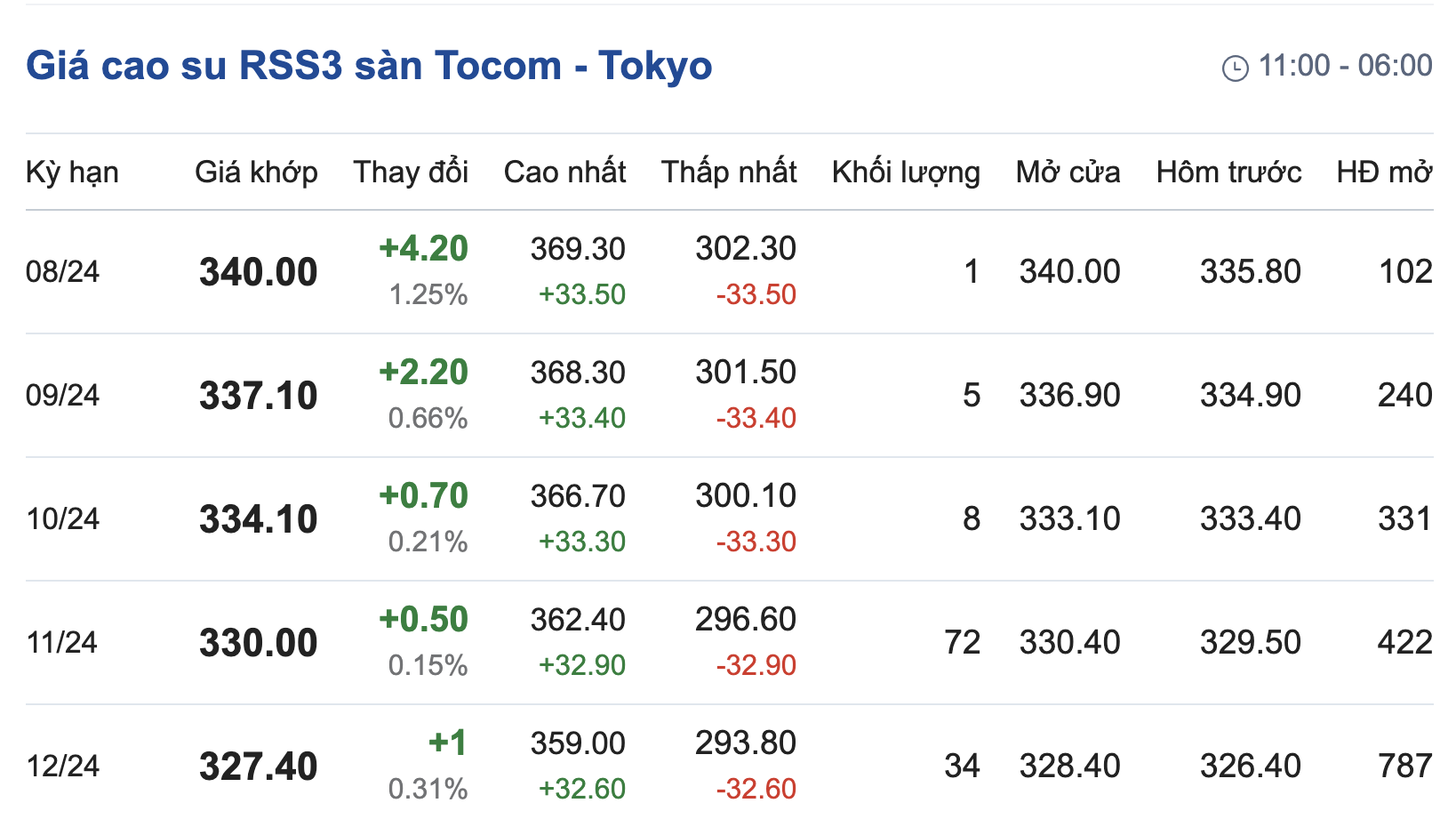 Tại Sở giao dịch hàng hóa Tokyo (TOCOM), giá cao su giao kỳ hạn tháng 9/2024 tăng 0,66% lên mức 337,1 yen/kg tại thời điểm khảo sát vào lúc 7h20 (giờ Việt Nam).