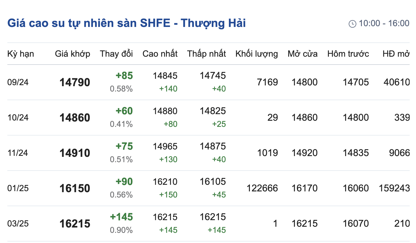 Trên Sàn giao dịch hàng hóa tương lai Thượng Hải (SHFE), giá cao su RSS3 giao kỳ hạn tháng 9/2024 tăng 0,58% ở mức 14.790 nhân dân tệ/tấn.