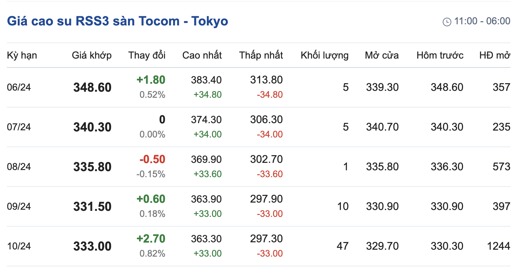 Tại Sở giao dịch hàng hóa Tokyo (TOCOM), giá cao su giao kỳ hạn tháng 6/2024 tăng 0,52% lên mức 348,6 yen/kg tại thời điểm khảo sát vào lúc 6h30 (giờ Việt Nam).