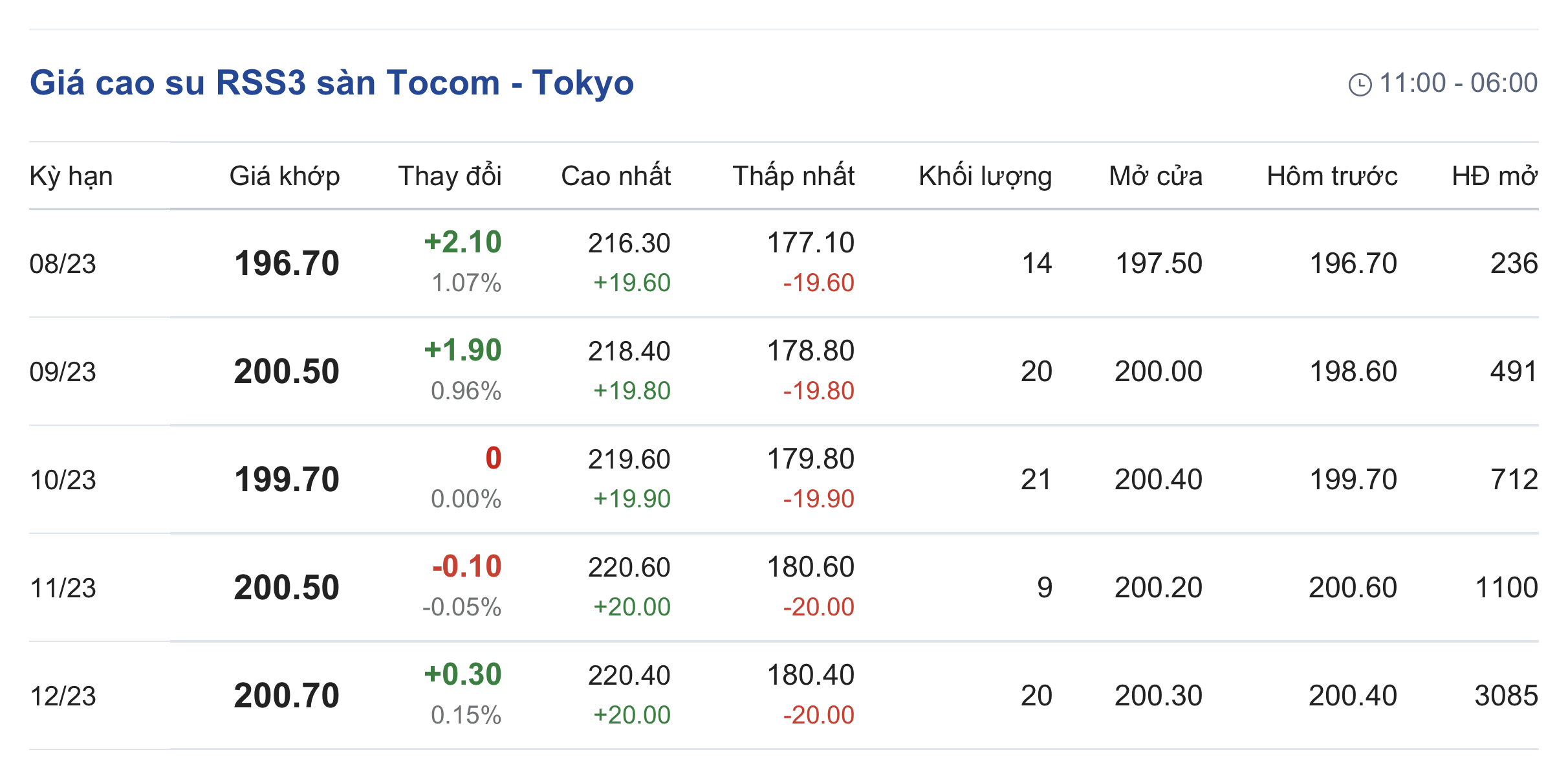 Tại Sở giao dịch hàng hóa Tokyo (TOCOM), giá cao su kỳ hạn giao tháng 8/2023 đạt mức 196,7 yen/kg, tăng 1,07% (tương đương 2,1 yen/kg) tại thời điểm khảo sát vào lúc 6h42 (giờ Việt Nam).