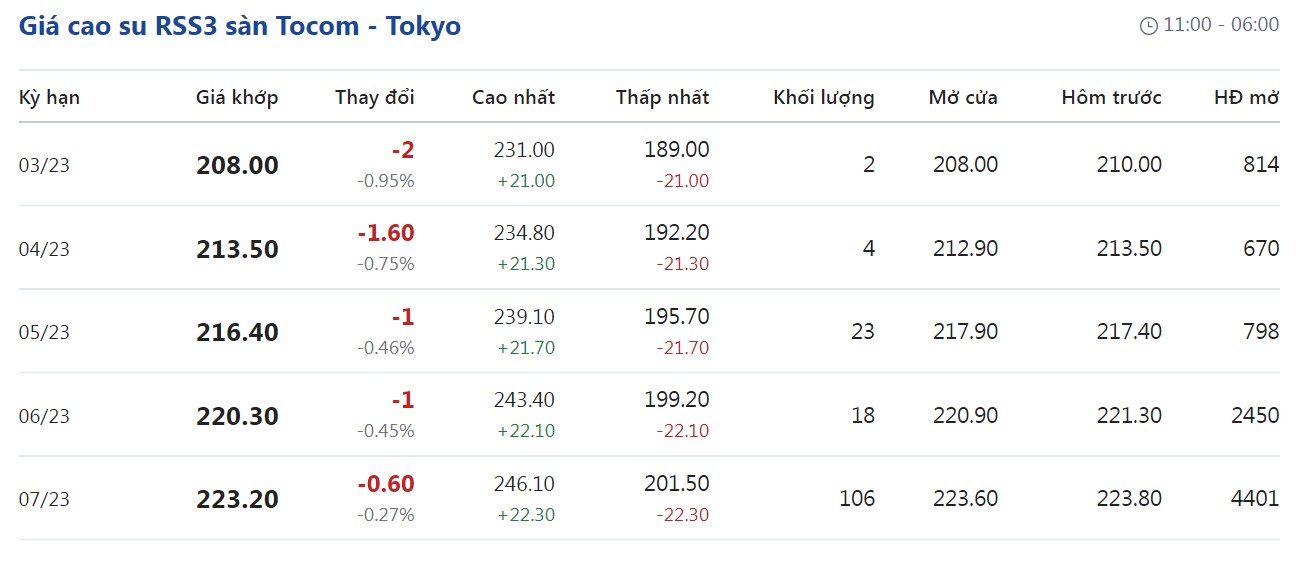 Tại Sở giao dịch hàng hóa Tokyo (TOCOM), giá cao su kỳ hạn giao tháng 2/2023 đạt mức 208 yen/kg, giảm 0,95% (tương đương 2 yen/kg) tại thời điểm khảo sát vào lúc 7h30 (giờ Việt Nam).