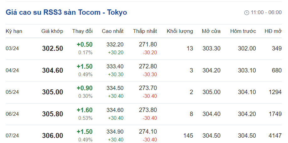 Tại Sở giao dịch hàng hóa Tokyo (TOCOM), giá cao su kỳ hạn giao tháng 3/2024 đạt mức 302,5 yen/kg, tăng 0,5% (tương đương 0,17 yen/kg) tại thời điểm khảo sát vào lúc 7h00 (giờ Việt Nam).
