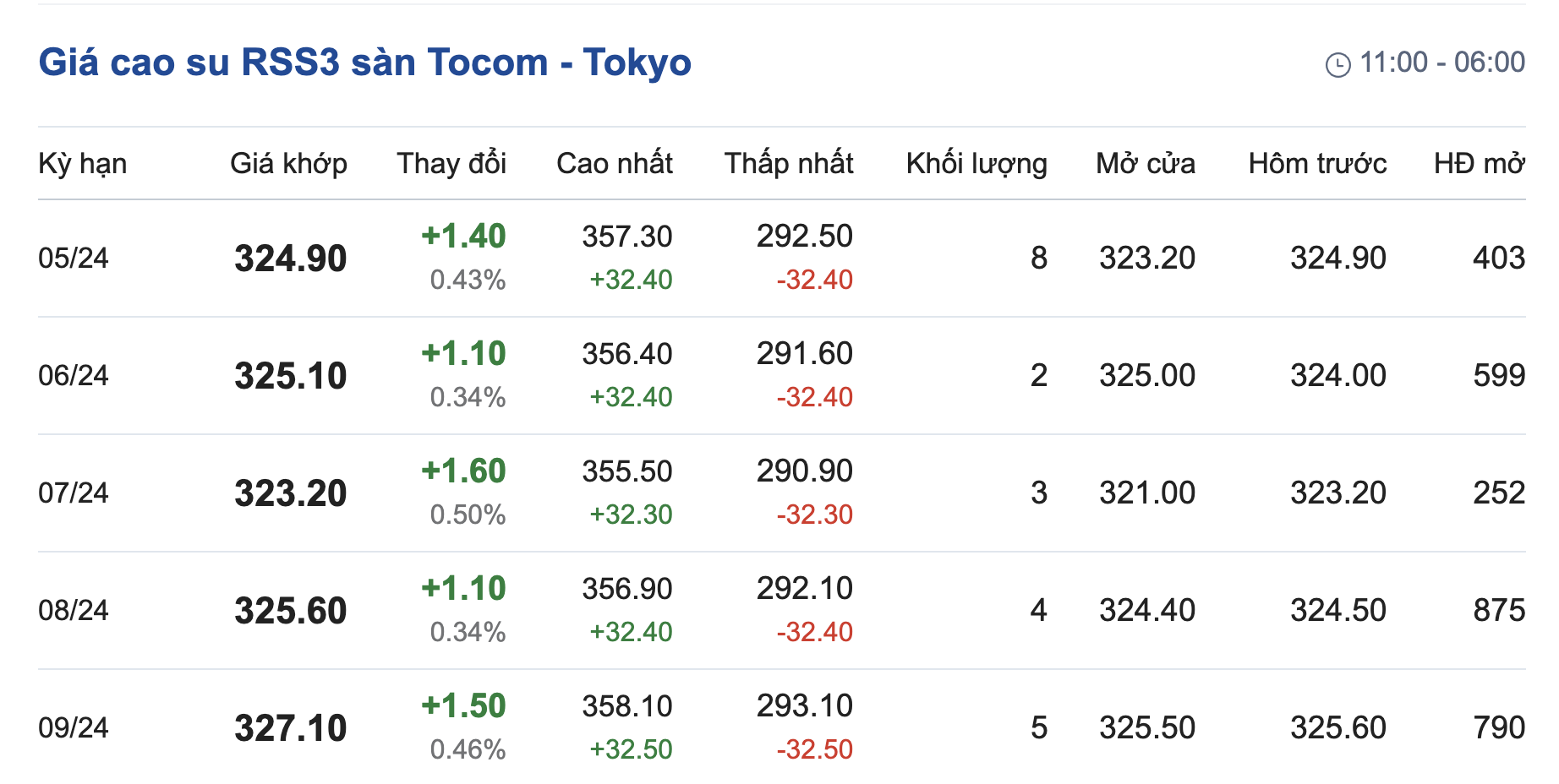 Cao su RSS3 giao dịch trên sàn Tocom - Tokyo từ 11h00 đến 17h15, 18h30 đến 06:00 (hôm sau), giờ Việt Nam.