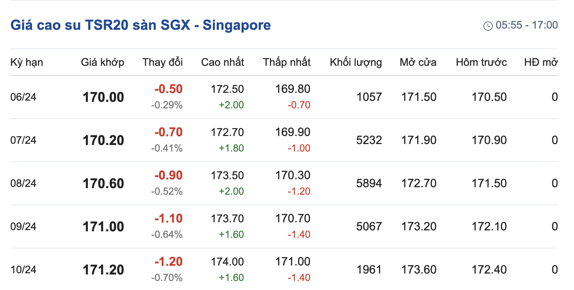 Theo đó, giá cao su giao kỳ hạn tháng 6/2024 ở mức 170 US cent/kg. Kỳ hạn giao hàng tháng 7/2024 là 170,2 US cent/kg, giảm 1,98%. Kỳ hạn giao hàng tháng 8/2024 là 170,6 US cent/kg, giảm 0,52%. Kỳ hạn giao hàng tháng 9/2024 là 170.1 US cent/kg giảm 0,64%. Kỳ hạn giao hàng tháng 10/2024 là 171.2 US cent/kg giảm 0,70%.