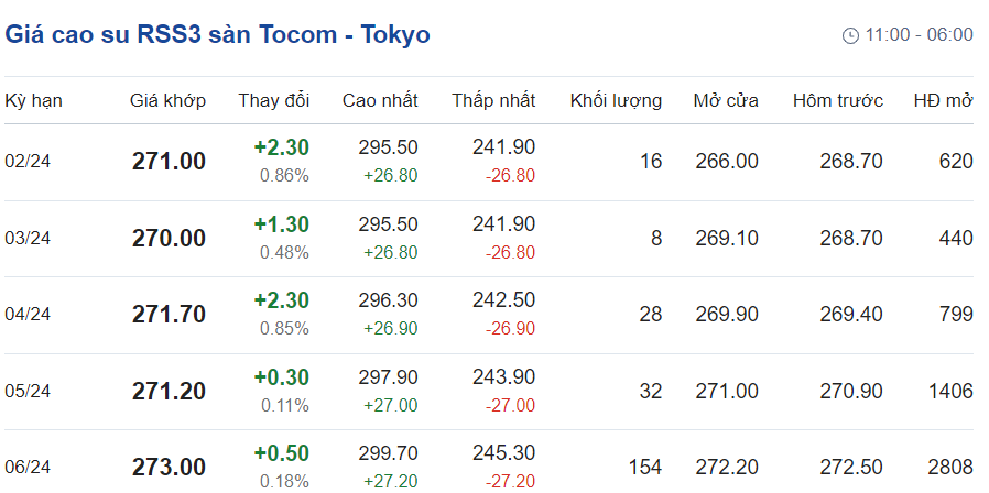 Tại Sở giao dịch hàng hóa Tokyo (TOCOM), giá cao su kỳ hạn giao tháng 1/2024 đạt mức 271 yen/kg, tăng 0,86% (tương đương 2,3 yen/kg) tại thời điểm khảo sát vào lúc 6h55 (giờ Việt Nam).