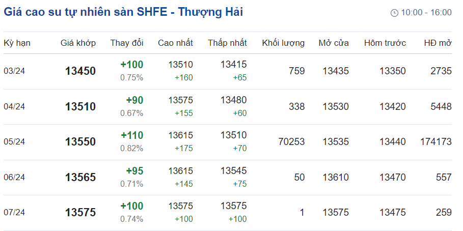 Trên Sàn giao dịch hàng hóa tương lai Thượng Hải (SHFE), giá cao su RSS3 giao kỳ hạn tháng 3/2024 được điều chỉnh lên mức 13.450 nhân dân tệ/tấn, tăng 0,75% (tương đương 100 nhân dân tệ) so với giao dịch.
