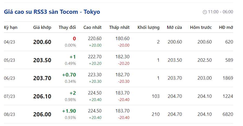 Tại Sở giao dịch hàng hóa Tokyo (TOCOM), giá cao su kỳ hạn giao tháng 3/2023 được ghi nhận ở mức 200,6 yen/kg tại thời điểm khảo sát vào lúc 6h15 (giờ Việt Nam).