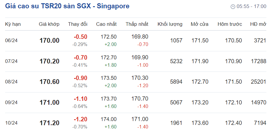 Trên Sàn giao dịch hàng hóa tương lai Singapore (SGX), giá cao su TSR20 giao kỳ hạn tháng 6/2024 ở mức 170 US cent/kg, giảm 0,29%.