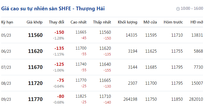 Trên Sàn giao dịch hàng hóa tương lai Thượng Hải (SHFE), giá cao su RSS3 giao kỳ hạn tháng 5/2023 được điều chỉnh xuống mức 11.560 nhân dân tệ/tấn, giảm 1,28% (tương đương 150 nhân dân tệ) so với giao dịch trước đó.