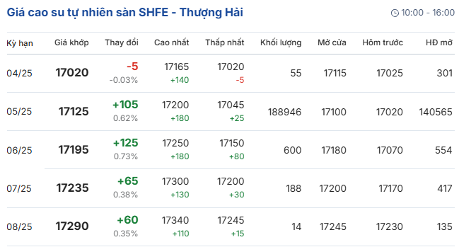 Trên sàn giao dịch Thượng Hải (SHFE) hợp đồng giao tháng 4/2025 giảm xuống mức 17.020 Nhân dân tệ/kg; hợp đồng giao tháng 5/2025 ở mức 17.125 Nhân dân tệ/kg; hợp đồng giao tháng 6/2025 ở mức 17.195 Nhân dân tệ/kg.
