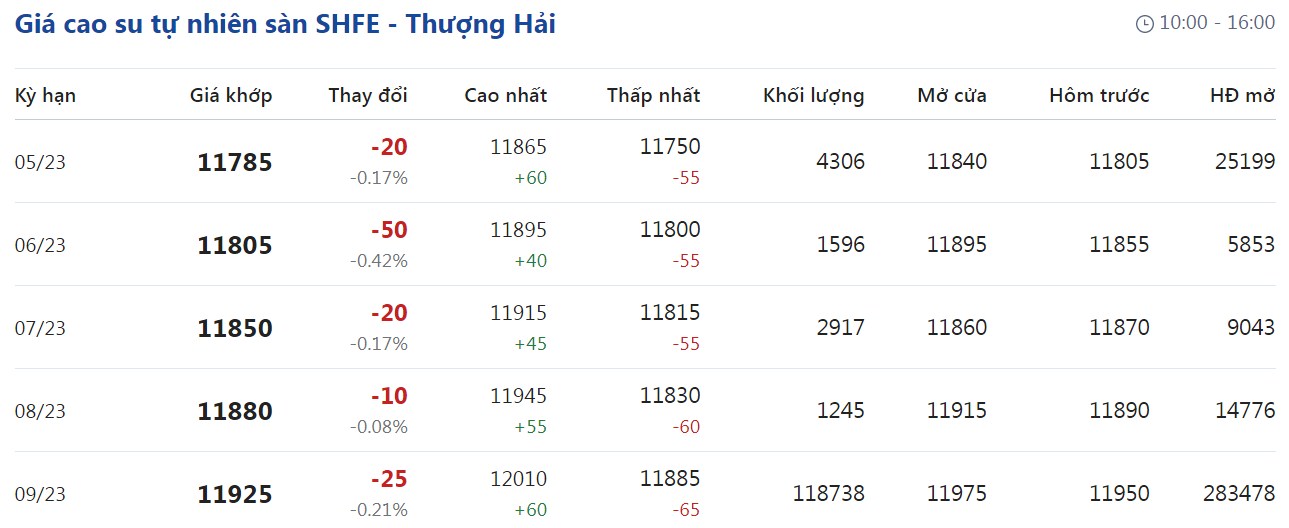 Trên Sàn giao dịch hàng hóa tương lai Thượng Hải (SHFE), giá cao su RSS3 giao kỳ hạn tháng 5/2023 được điều chỉnh xuống mức 11.755 nhân dân tệ/tấn, giảm 0,17% (tương đương 20 nhân dân tệ) so với giao dịch trước đó.