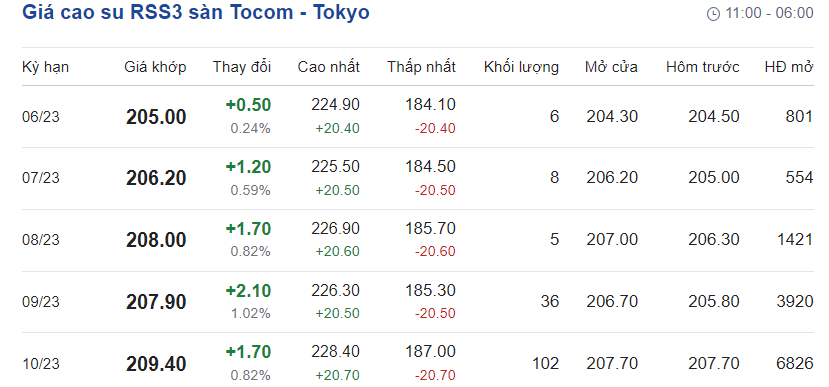 Tại Sở giao dịch hàng hóa Tokyo (TOCOM), giá cao su kỳ hạn giao tháng 6/2023 đạt mức 205 yen/kg, tăng 0,24% (tương đương 0,5 yen/kg) tại thời điểm khảo sát vào lúc 6h15 (giờ Việt Nam).