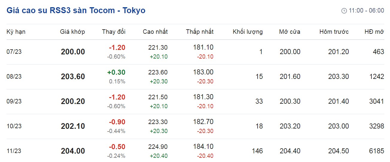 Tại Sở giao dịch hàng hóa Tokyo (TOCOM), giá cao su kỳ hạn giao tháng 7/2023 đạt mức 201,2 yen/kg, giảm 0,6% (tương đương 1,2 yen/kg) tại thời điểm khảo sát vào lúc 7h15 (giờ Việt Nam).