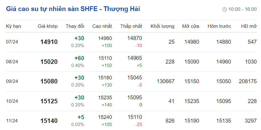 Trên Sàn giao dịch hàng hóa tương lai Thượng Hải (SHFE), giá cao su RSS3 giao kỳ hạn tháng 7/2024 tăng 0,2% ở mức 14.910 nhân dân tệ/tấn.